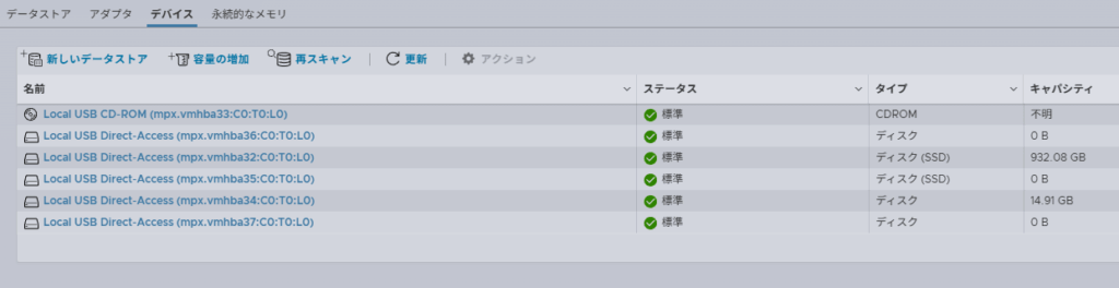OS が入っているところもデータストアに出来るよなぁとググってみたところ、USB のストレージはモノがなんであろうが、サポートの問題でデータストアに出来ないらしい。
