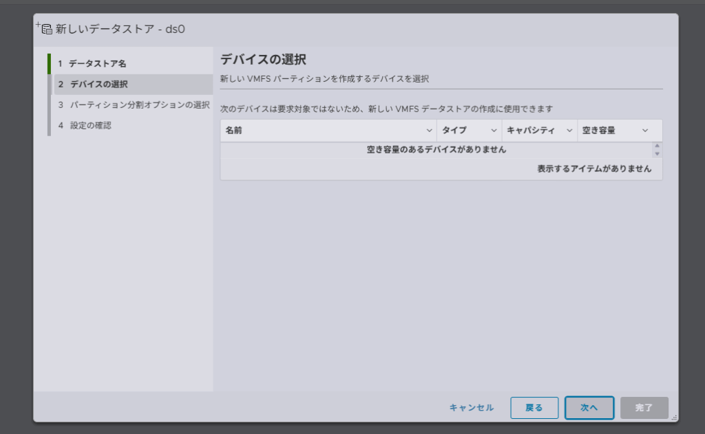 次に VM をぶっこむデータストアを切り出すか。とストレージの設定を見るもデータストアに使えるストレージがないと言われる。