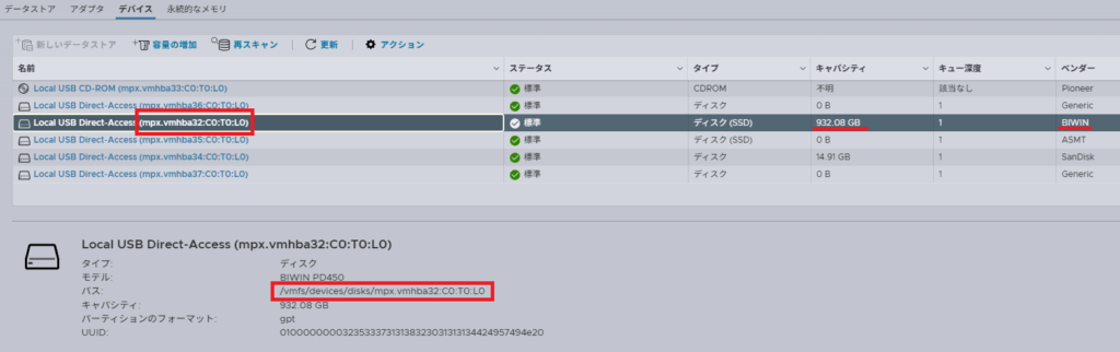 ※対象のデバイス(mpx.vmhbaXX)は容量やベンダ名から間違えずに特定すること。