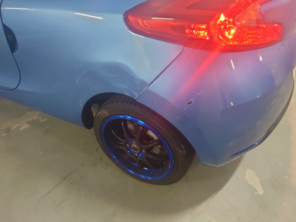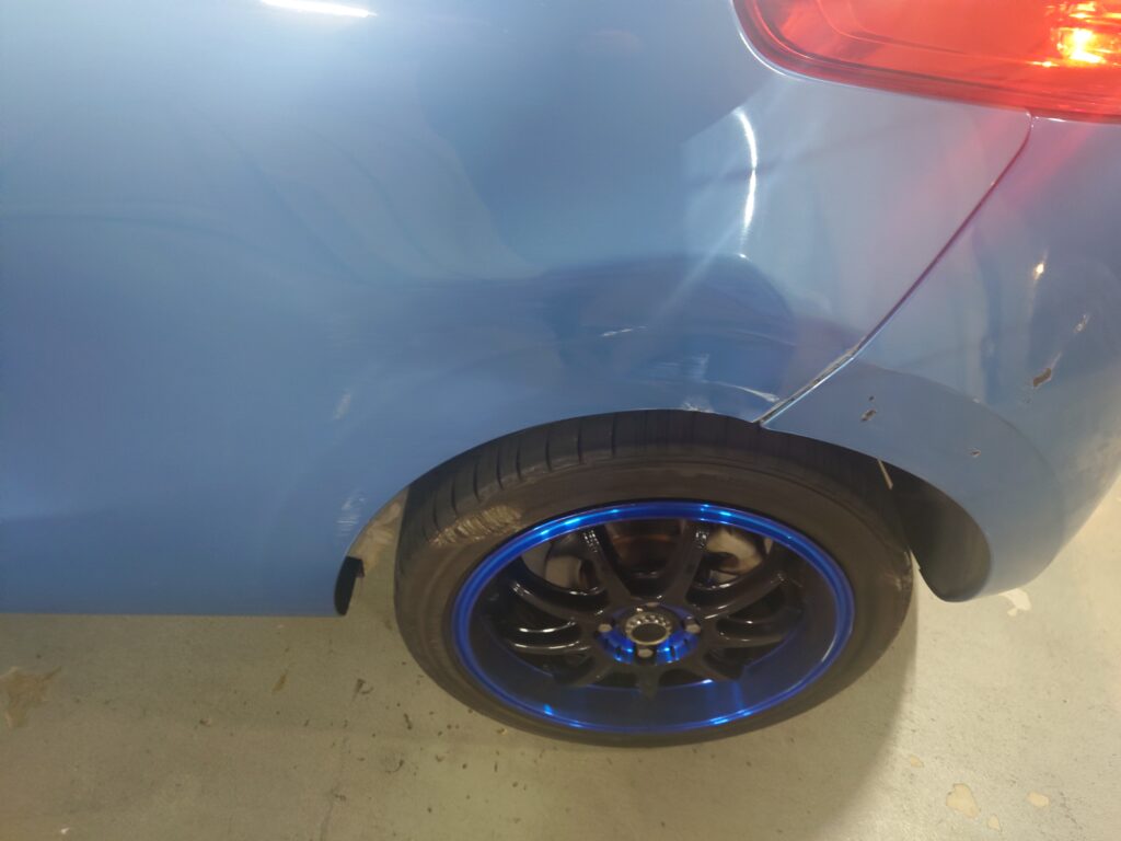リアクォータ(リアタイヤ上)にキズと凹み。
