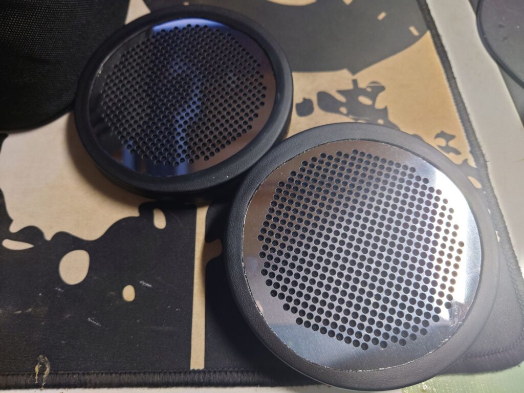 頭を支える部分のペラい樹脂?パーツはいつまで代替品を入手できるか不安だけど、イヤーパッド部分は金属の穴あき板がドライバー部分の磁力でくっついて固定されるシンプルな仕組みのおかげで、大きさが 10.5cm であれば大体付けられそう。(金属部分の穴の大きさとかも音に影響しそう)