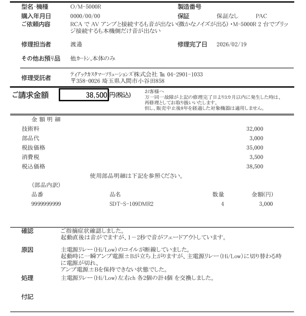 見積時と同じく主電源リレー(SDT-S-109DMR2) を 4 個交換し、技術料諸々込みで 38,500 円。
